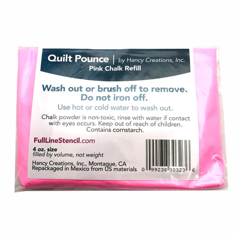 Quilt Pounce Pink Chalk Refill. Transferring any size or variety of stencil is easy, fun, instant and accurate. This high-quality chalk is non-staining and shows up bright and clear even on the darkest fabrics. The chalk powder will brush or wash off.